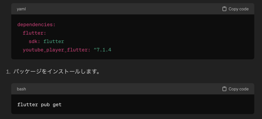 これで、Flutterアプリ内でYouTube動画を再生する準備が整いました。このサンプルコードを実行すると、指定したYouTube動画がアプリ内で再生されます。