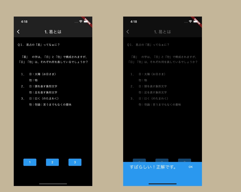 「易占クイズに挑戦する」ボタンをタップすると、クイズが出題されます。