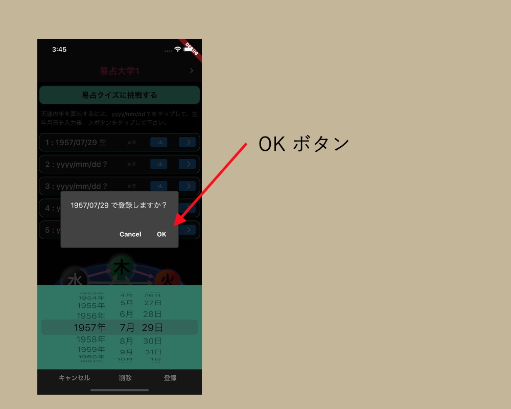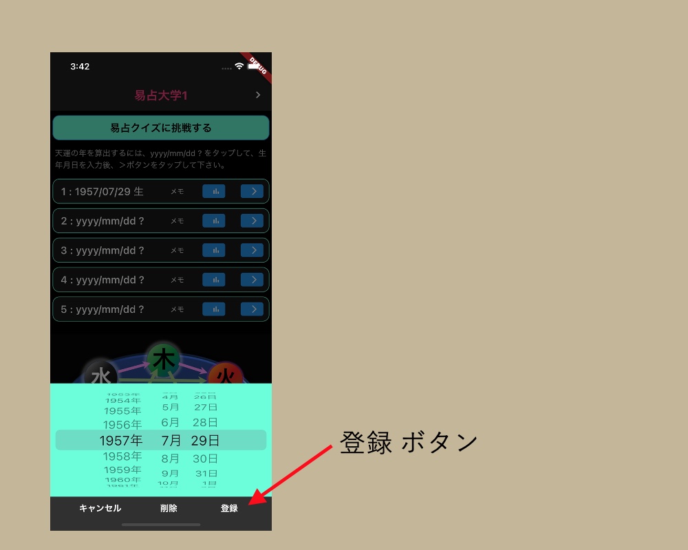 生年月日設定ボタン(yyyy/mm/dd ?) をタップします。